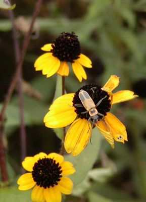 A goldenrod soldier beetle walks across yellow wildflowers.