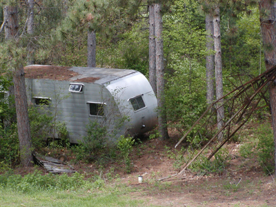 An old-style trailer parked among trees. This was a thumbnail photo in the 2004 book, Wisconsin 24/7.