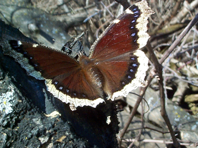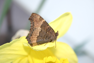 A brown butterfly, possibly a mourning cloak with its wings closed, rests on a daffodil.