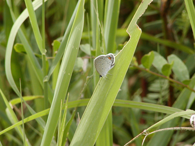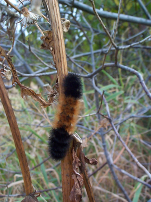 A wooly bear caterpillar climbing up a stalk.  This will grow to become an Isabella moth.