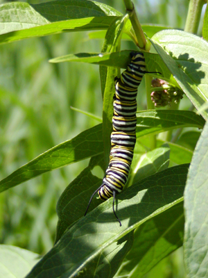 This black, white, and yellow caterpillar will grow up to become an orange, black, and white monarch butterfly.