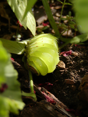 An almost fluorescent green and very large caterpillar which will one day grow into one of the larger Wisconsin moth species.