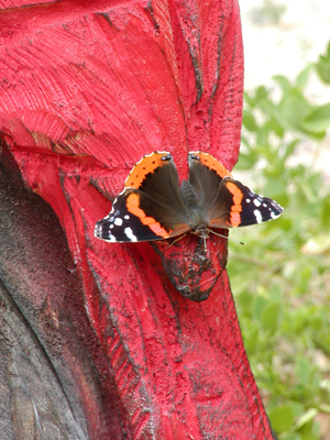 A red admiral butterfly that alit on a wooden carving of a brilliantly colored cardinal.